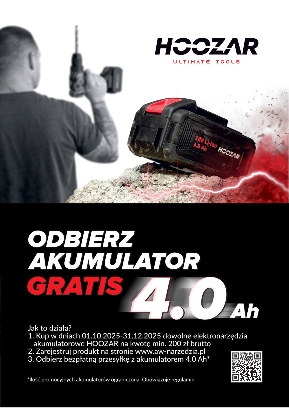 Na koniec warto wspomnieć o akcji, która realnie podnosi opłacalność zakupu sprzętu HOOZAR. Do końca grudnia 2025 roku wystarczy kupić produkty tej marki za minimum 200 zł, a następnie zarejestrować je na stronie www.aw-narzedzia.pl, żeby otrzymać dodatkowy akumulator o pojemności 4.0 Ah. Nie trzeba wcale kompletować dużego zestawu – wystarczy jeden produkt, by spełnić próg kwotowy. Co ważne, liczba akumulatorów w promocji jest ograniczona, dlatego liczy się kolejność zgłoszeń. To opcja szczególnie korzystna przy sprzętach, które pracują pod obciążeniem albo są używane na terenach rekreacyjnych czy działkach, gdzie ładowarka nie zawsze jest pod ręką.